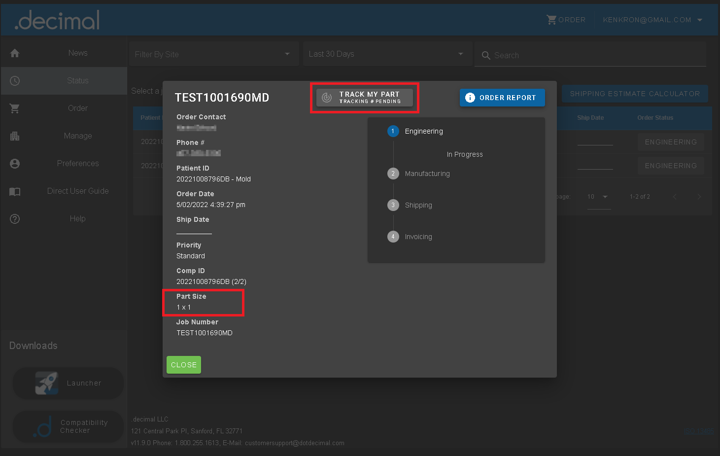 Detailed information can be viewed for ordered parts from the Job Status list. This information includes some basic details from the order file as well as manufacturing status and shipment tracking information.