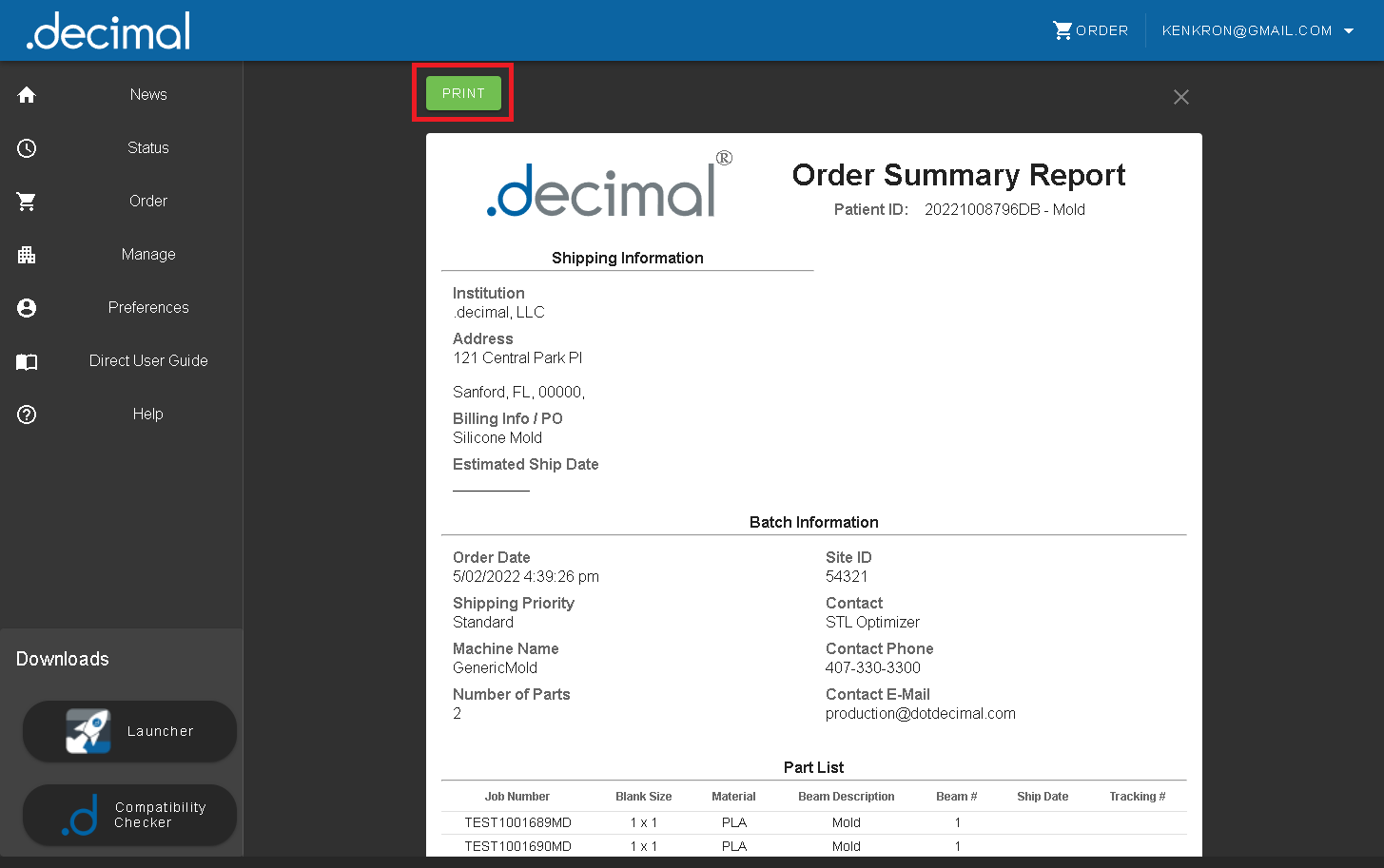 Fig. 1: The details for this ordered jobAn Order Summary Report can be also be viewed and downloaded (or printed) from the Job Status list for any ordered devices. Simply follow the steps above to locate the part needed, then from the job details view: