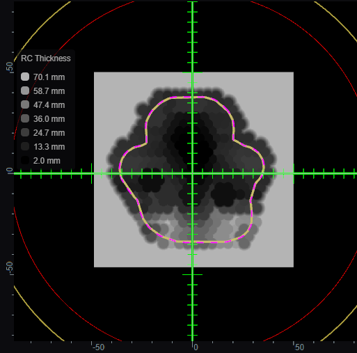 A range compensator is automatically added for any snout that has range compensator information defined for use in the site specific machine model. The site model also includes the maximum and minimum possible thickness values, the material, and the extents (outer dimensions) of the range compensators for each snout.