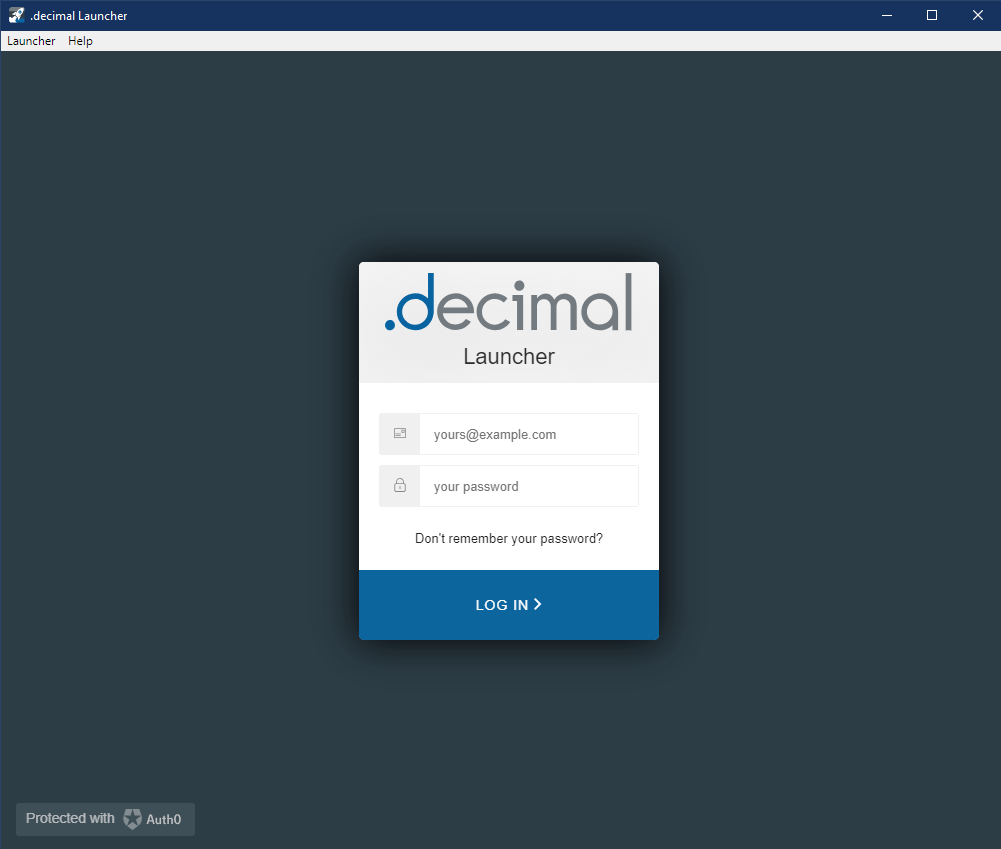 Authentication is done through your .decimal Auth0 account. If you do not have an Auth0 account please contact your site’s .decimal admin or .decimal customer service at 1-800-255-1613. Once you have your Auth0 account, open the launcher and you should be directed to the login page: