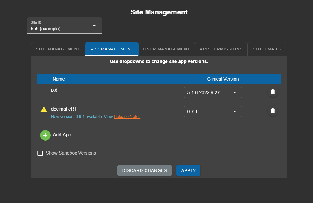 Once you select your site from the dropdown, you will see a list of all the applications available for that site. You will be able to see your currently selected version of each app and be able to update it using the drop down.