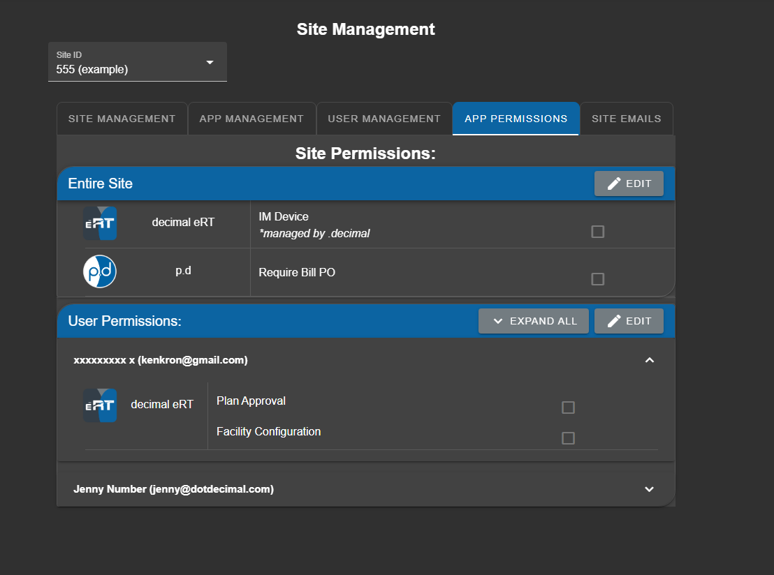 Some .decimal applications have permissions that can be changed, either site wide for all users, or on a single user-by-user basis. These permissions can be seen in the “App Permissions” tab. Site wide permissions are shown at the top, and user permissions are underneath. Clicking on a user will show or hide the permissions applied to them. The checkbox to the right indicates whether a permission is enabled. Permissions noted as “*managed by .decimal” can not be changed by users and must be changed by .decimal staff (e.g.: this is a separate purchased license).