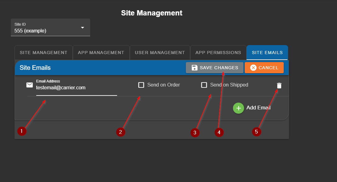 As stated a user's personal email settings still apply regardless of what is listed here when they order a part. Meaning, if the Site Emails list is empty but they choose to receive email notifications when their part ships then they will still receive their desired email.