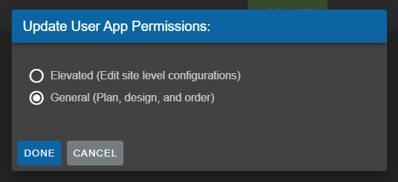 - Elevated:The highest level of user permissions, generally allows for managing machines, site configurations, access to sandbox versions, plan approvals etc…