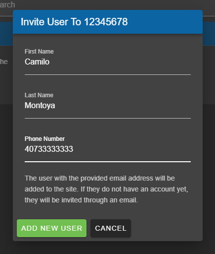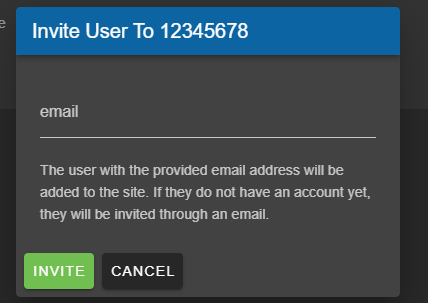 In order to add a new user to your site simply hit the “ADD USER” button and you will be prompted to enter the email of the user you wish to add. If the user is an existing decimal User then they will simply be added to your site along with any sites they currently belong too.