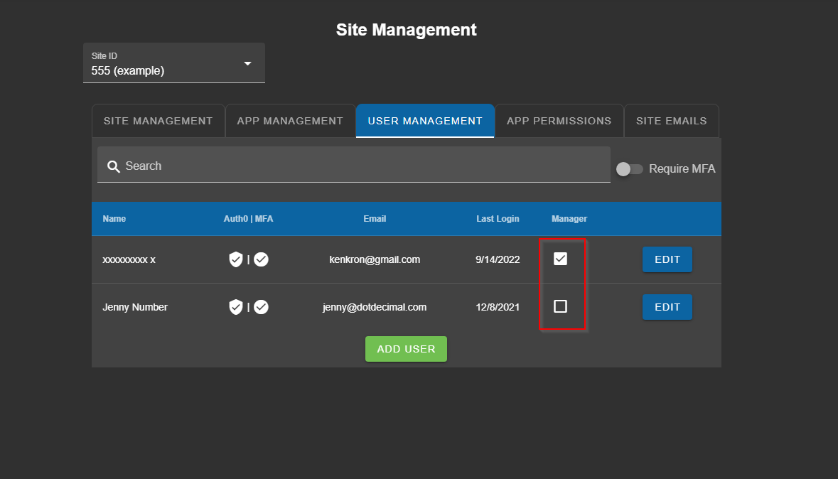 If you select the “Users” tab on this page you will be taken to the user list for this site. The users information is displayed, along with a checkmark or x in a circle indicating whether they have multifactor authentication enabled. Here you can see, edit, add, and remove users for the selected site. If extra security is necessary, the “Require MFA” switch may be enabled, requiring all members of the site to log in with Multi-Factor Authentication.