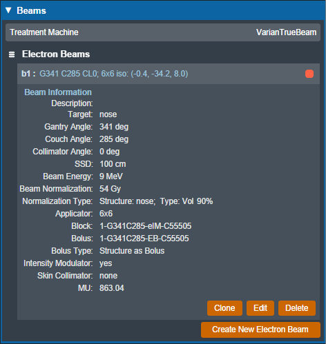 - Clone: Create an identical copy of the selected beam and add it to the plan.