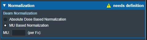 If MU dose conversion tables exist in the machine selected for the plan, MU based normalization can be selected to scale the relative dose based on a user specified MU value per fraction. In this case, the absolute beam dose value is calculated based on the given MU value per fraction. MU dose conversion data tables can be imported in the Site Configuration Machine Settings.