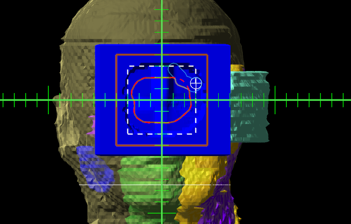 - Checking the “Occlude by Target” option makes the calculations account for the relative depth positions of the target and avoidance structure when determining the area to avoid. More specifically, the visible portion of the target (target volume that is in front of the avoidance structure) will not be blocked by the aperture. Note that just the inferior edge of the Cord is blocked by the aperture as this is the only portion that is visible (not behind the target) and the part of the Cord that is behind the PTV is not blocked.